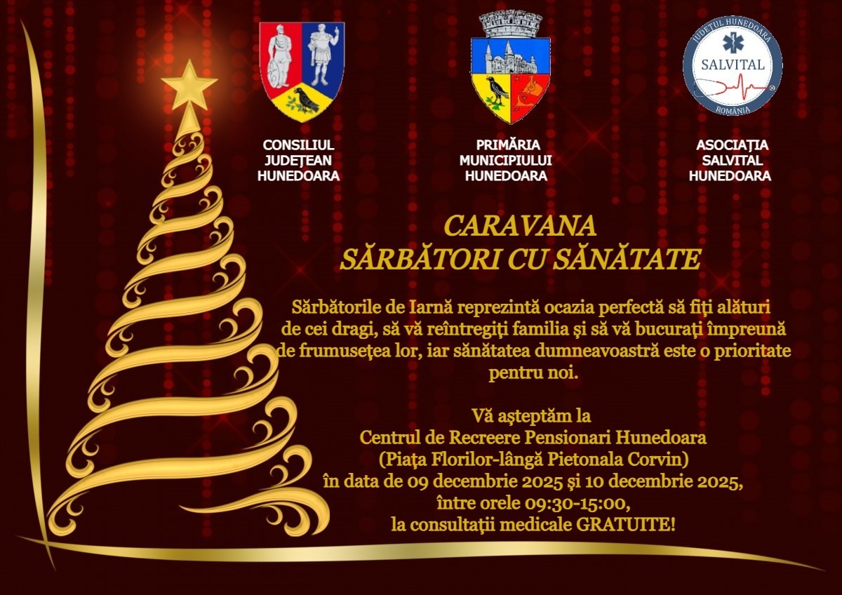 „Primăria municipiului Hunedoara, prin Direcţia de Asistenţă Socială, în parteneriat cu Asociaţia Salvital şi Consiliul Judeţean Hunedoara organizează o nouă acţiune de testări medicale gratuite. Acţiunea va avea loc marţi (9 decembrie) şi miercuri (10 decembrie), între orele 09.30 – 15.00”, transmite Primăria Municipiului Hunedoara.