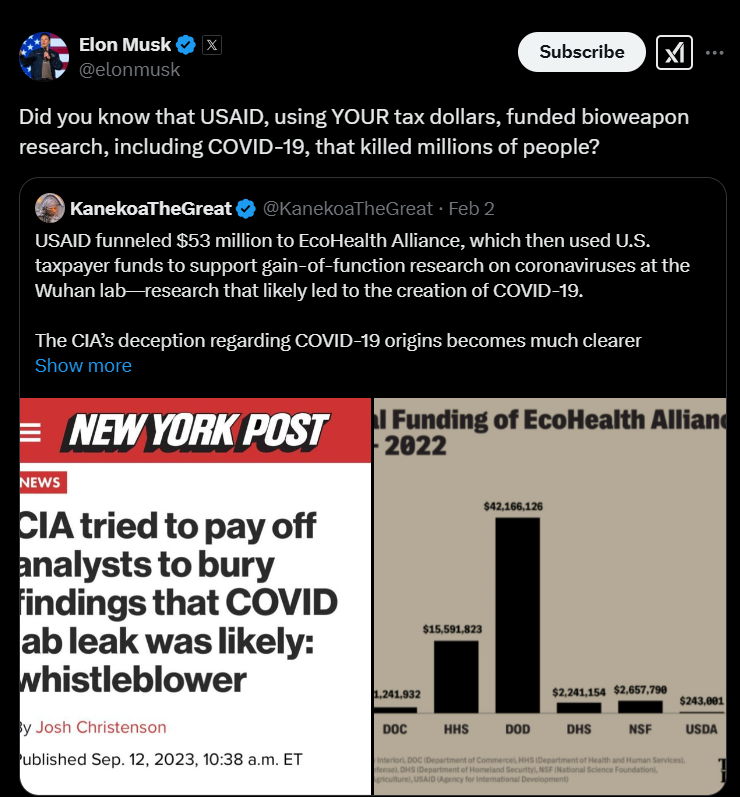 „Știați că USAID a folosit banii din impozitele dumneavoastră pentru a finanța cercetarea armelor biologice, inclusiv COVID-19, care a ucis milioane de oameni? ”, a scris Elon Musk pe X.