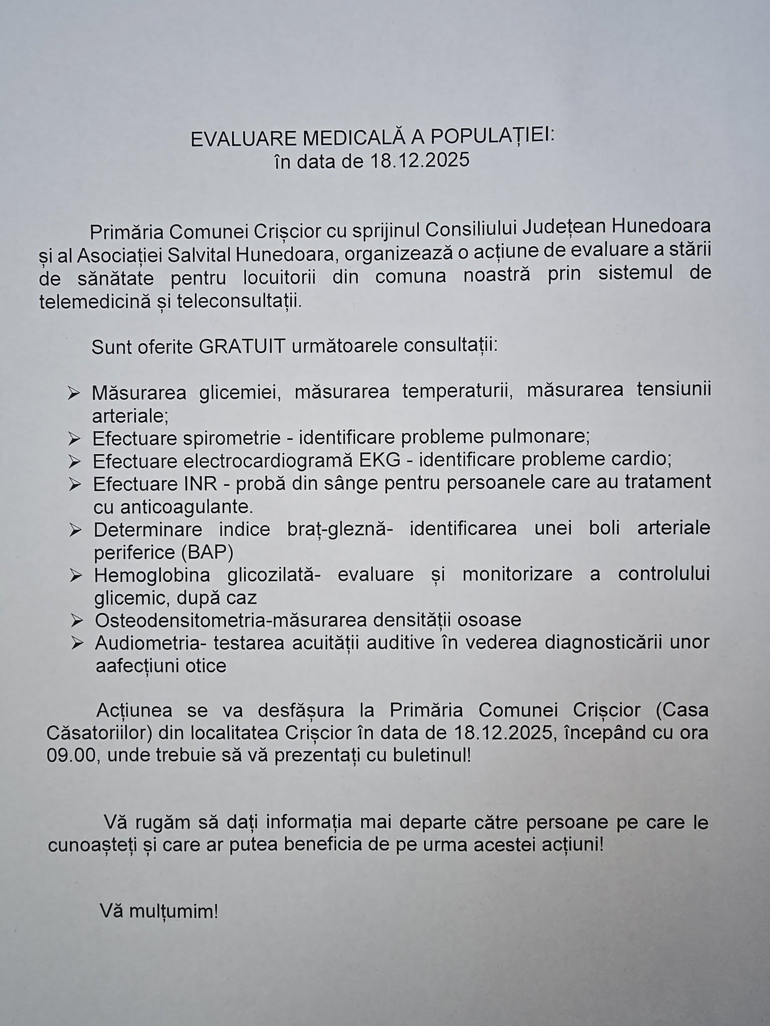 Primăria Comunei Crișcior, cu sprijinul Consiliului Județean Hunedoara și al Asociației Salvital Hunedoara, anunță organizarea unei ample acțiuni de evaluare medicală gratuită, dedicată locuitorilor din comună. Evenimentul va avea loc în data de 18 decembrie 2025, începând cu ora 09:00, la sediul Primăriei Comunei Crișcior (Casa Căsătoriilor).
