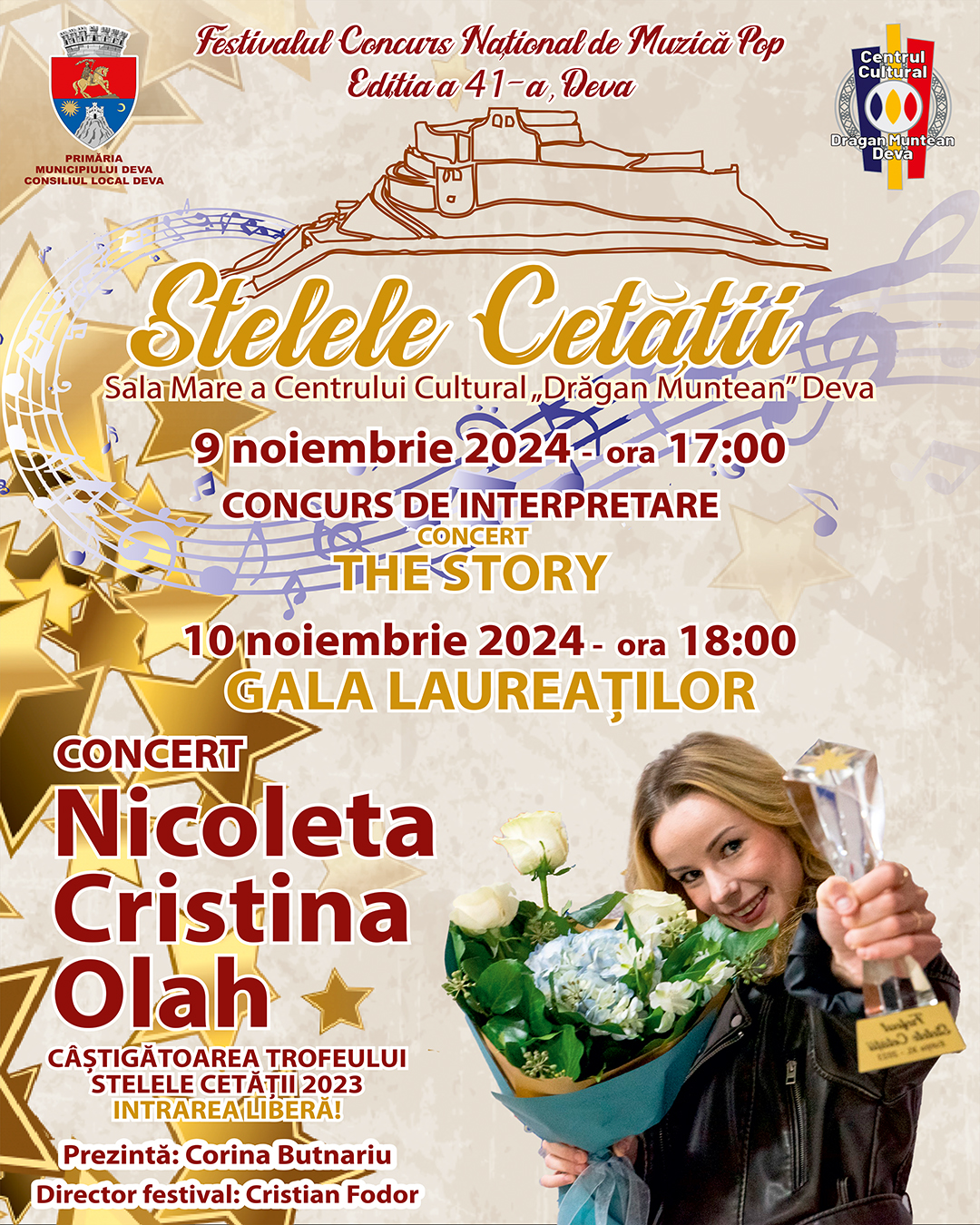 Stelele Cetății strălucesc din nou la Deva! Primăria Municipiului Deva și Centrul Cultural „Drăgan Muntean” Deva organizează în perioada 9-10 noiembrie 2024, în Sala Mare a Centrului Cultural „Drăgan Muntean”, cea de-a 41-a ediție a Festivalului Concurs Național de Muzică Pop „Stelele Cetății”.