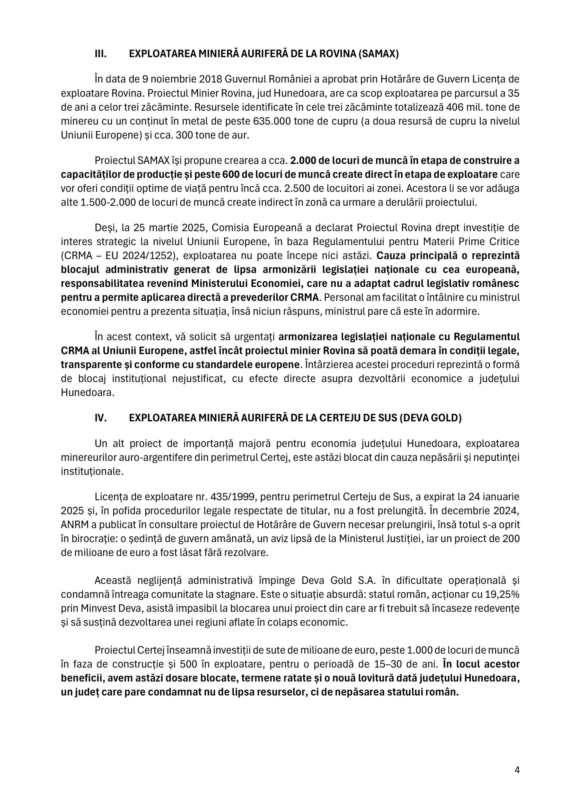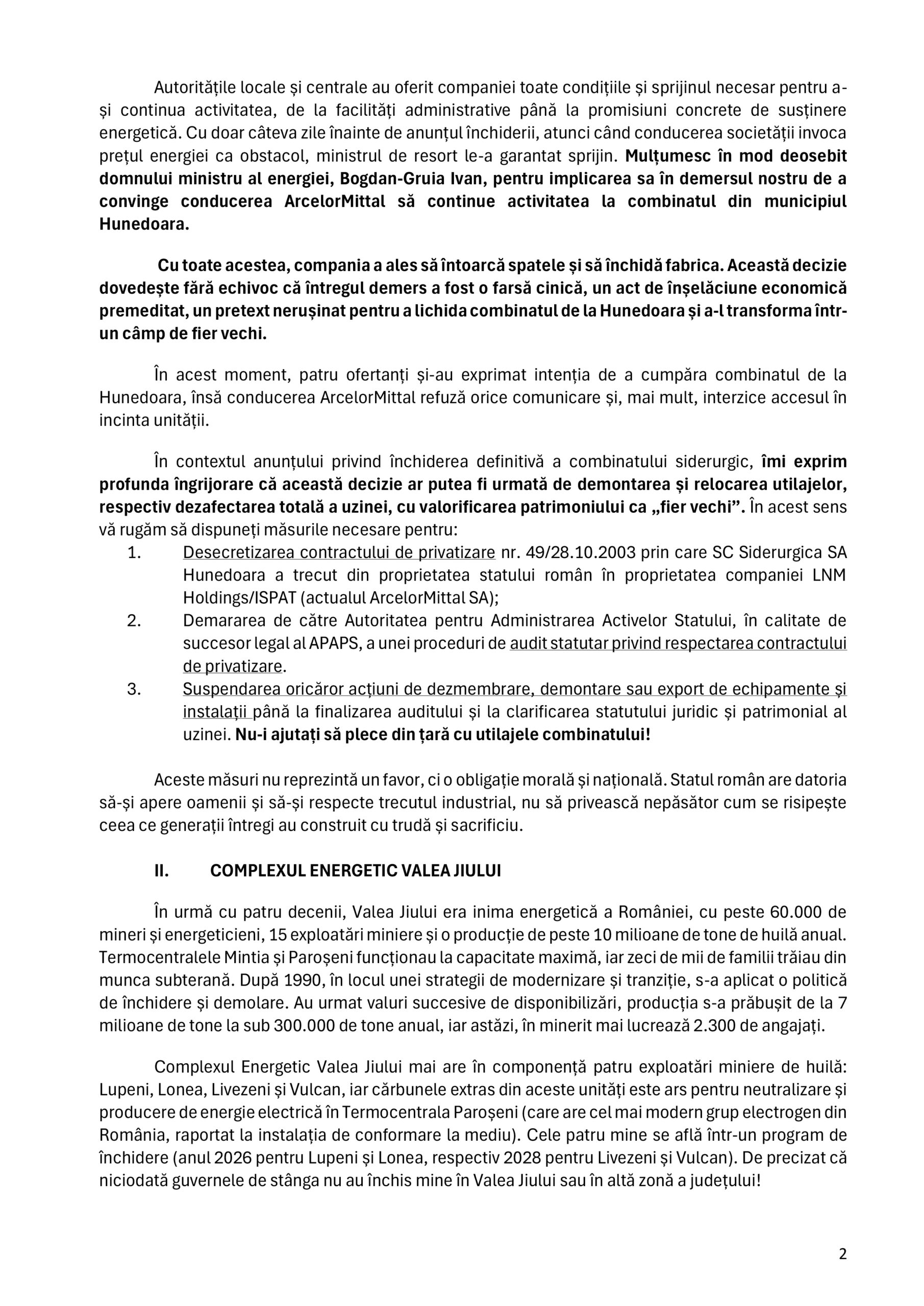 „Județul Hunedoara nu cere pomană! Nu cerem subvenții, ci șansa de a reconstrui, de a transforma o istorie industrială în viitor economic. Închiderea combinatului, a fabricilor din zona Brad, suprimarea mineritului și blocarea exploatării resurselor minerale reprezintă adevărate drame locale și dau un semnal de slăbiciune a statului în fața pierderii controlului asupra propriilor active strategice”, spune preşedintele Consiliului Judeţean Hunedoara.