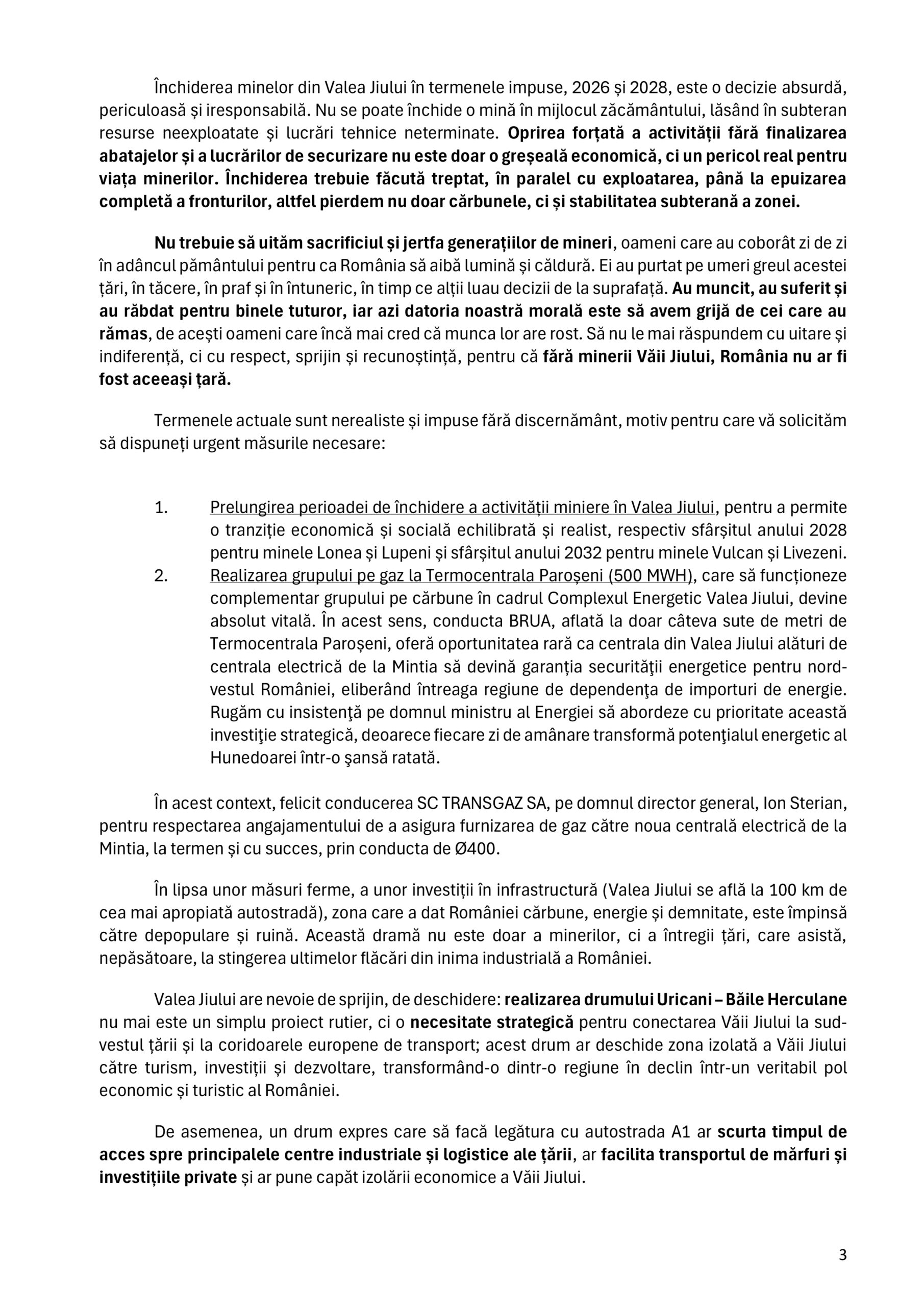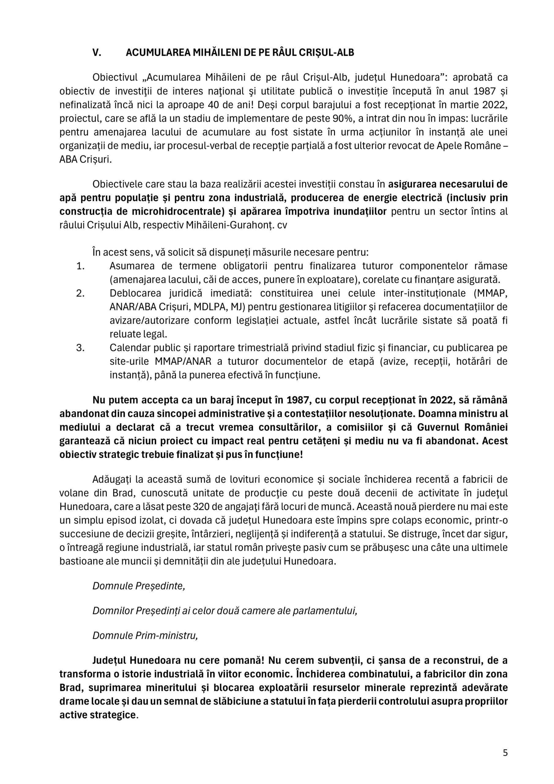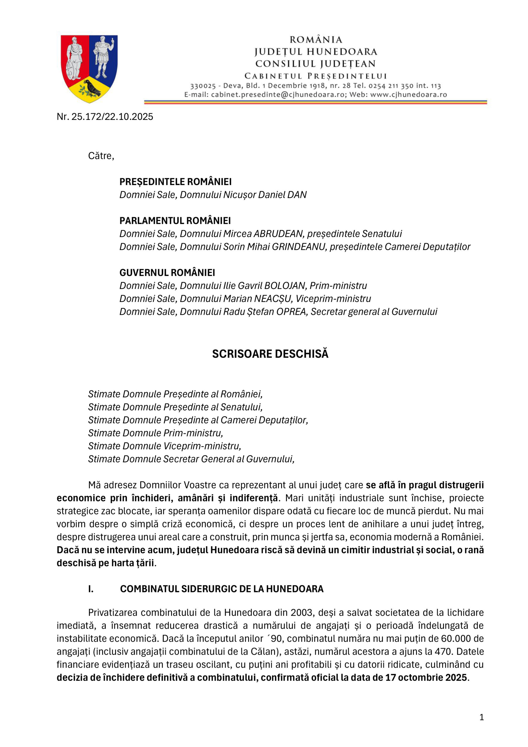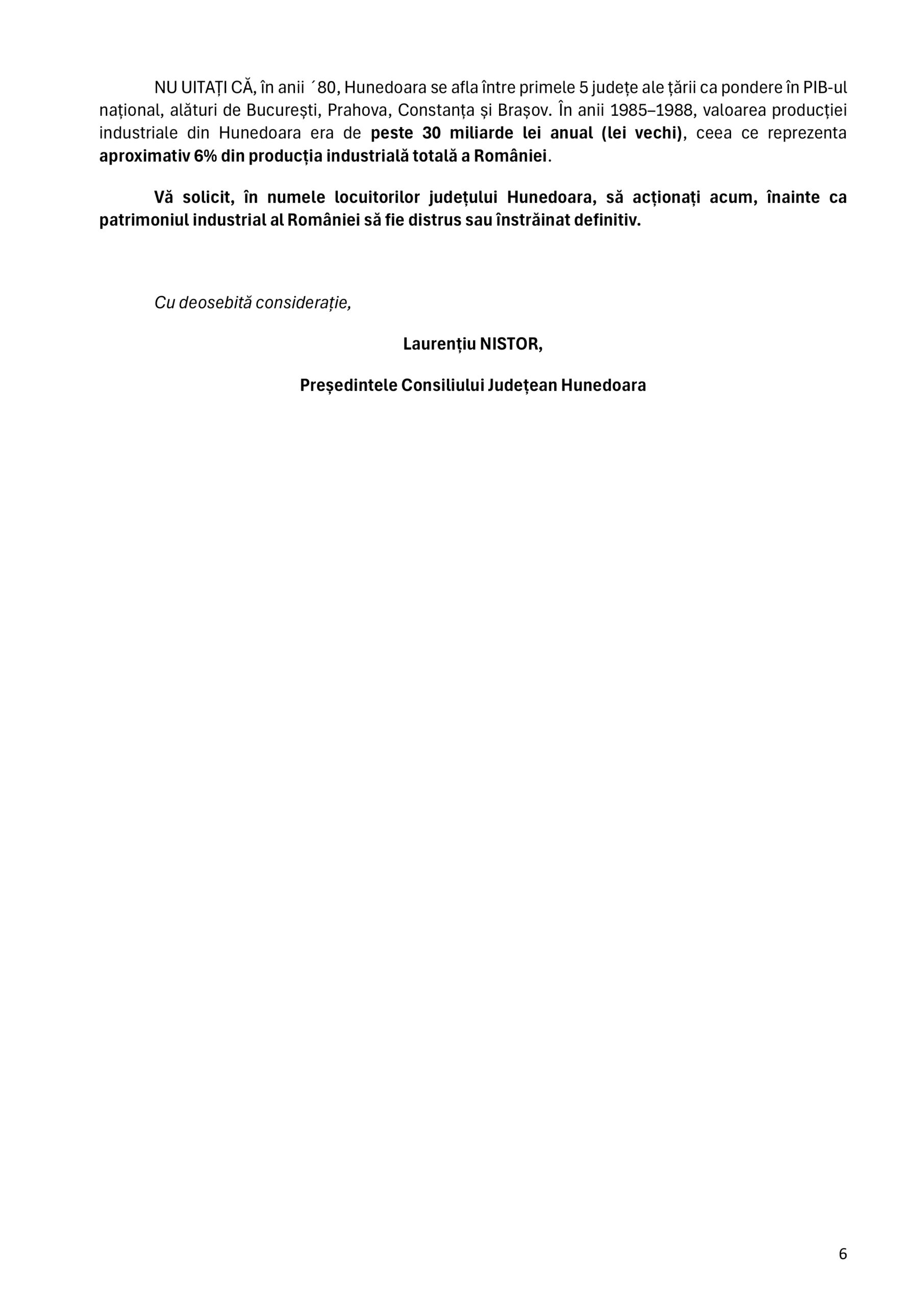 Preşedintele administraţiei judeţene a a transmis o scrisoare deschisă Președintelui României, Parlamentului și Guvernului prin care atrage atenția asupra situației sociale tot mai dificile și a declinului economic profund cu care se confruntă județul Hunedoara.
