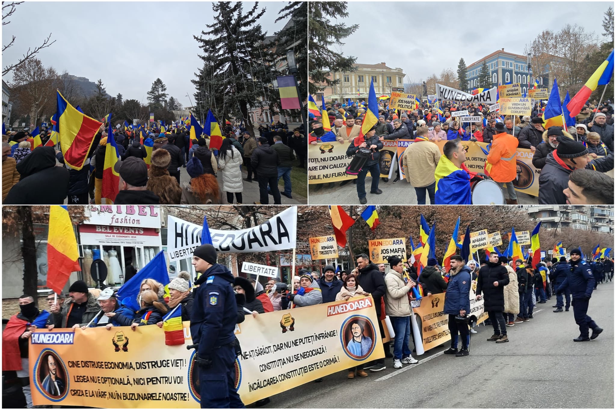 Astăzi, la Deva, a avut loc un amplu protest împotriva anulării alegerilor prezidențiale. Oamenii s-au strâns în fața Prefecturii Hunedoara, de unde au plecat într-un marș pe bulevardele centrale ale municipiului. Cu drapele tricolor și pancarte pe care au scris diverse mesaje, manifestanții au scandat sloganuri precum: „Turul doi înapoi!”, „Libertate!”, „Iohannis trădătorul!”, „Iohannis dictatorul!”, „Jos Guvernul!”.